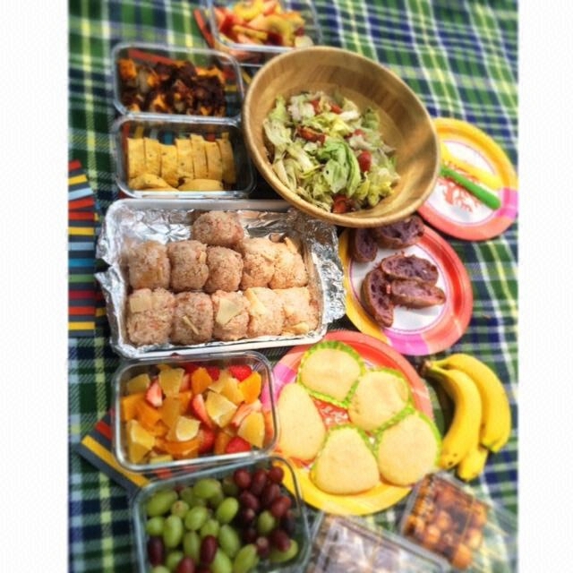 蒸しパン、ひじきサラダ、タケノコいり桜えびおにぎり、鶏チーズ焼きにフルーツなどなど!すごい〜!