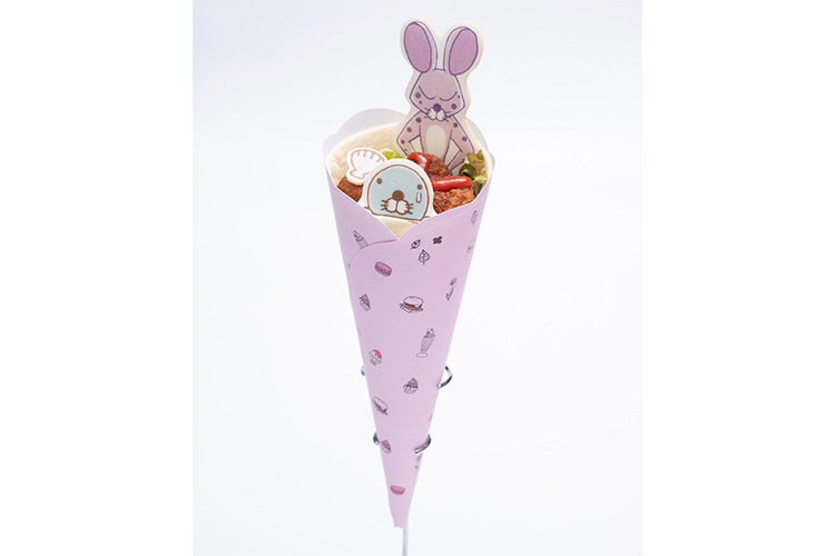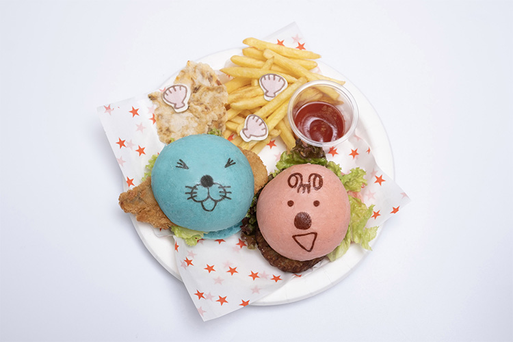 カフェのメニューはといえば、前回大好評だった「ぼのぼのバーガー」がパワーアップして再登場!青いバンズのぼのぼのバーガーには白身フライが、ピンクのバンズのシマリスくんバーガーにはハンバーグがサンド。仲良しのふたりのようにペアになった、かわいくてボリュームも満点の一皿です。