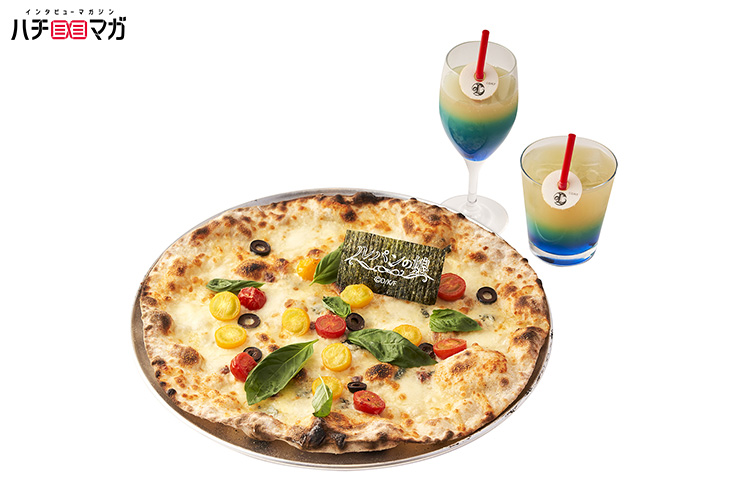 赤(トマト)、黄(トマト)、緑(バジル)、黒(オリーブ)、グレー(アンチョビ)の食材がのったピッツァに見た目にも鮮やかな青い(ブルーキュラソー)ドリンクを添えて、華(深田恭子)を中心とした“Lの一族”のテーマカラーをイメージした豪華セット。