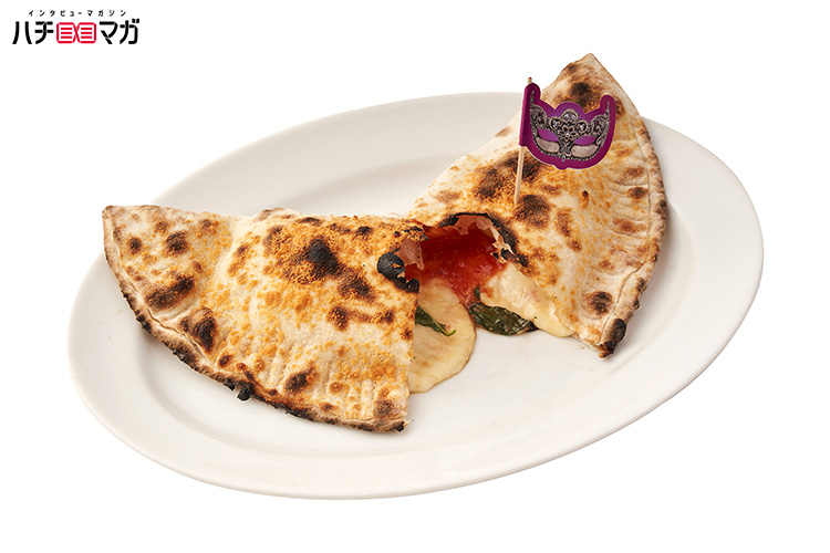 さらに、もう一品、フォルムが、華のヴェネティアンマスクにも似ている“包みピッツァ”にも「お宝どっさり風呂敷包みPIZZA」なるコラボ商品が。真ん中からナイフを入れると、中からモッアレラチーズ、バジル、トマトの“お宝”がとろ~り。マルゲリータをそのまま包み込んだような、コクがありながらも、あっさりした味わいがクセになりそう。