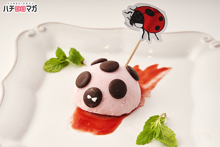 デザートには、劇中に登場する“てんとう虫”型の盗聴&盗撮器をイメージした冷たいアイスケーキ「てんとう虫3号が恋したチーズケーキ」がオススメです。さわやかなストロベリーチーズケーキと、イチゴソース、ビターなチョコベストマッチ。甘すぎず上品な味わいだから、お腹がいっぱいでもいけちゃいそう。