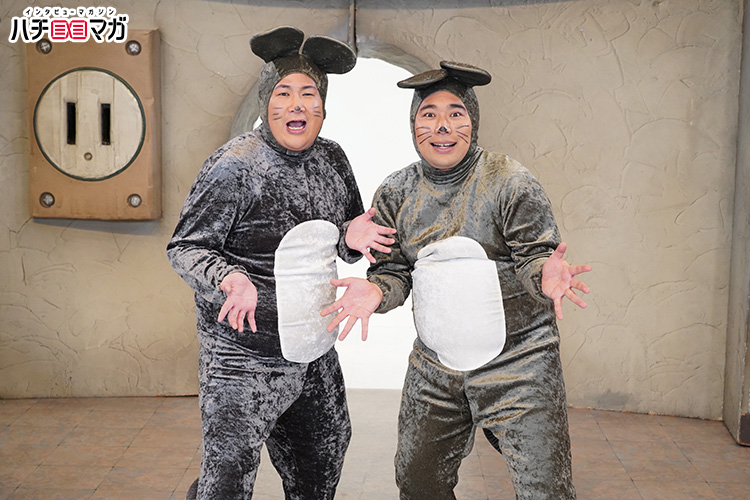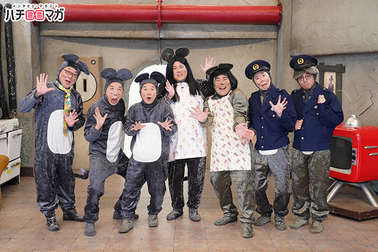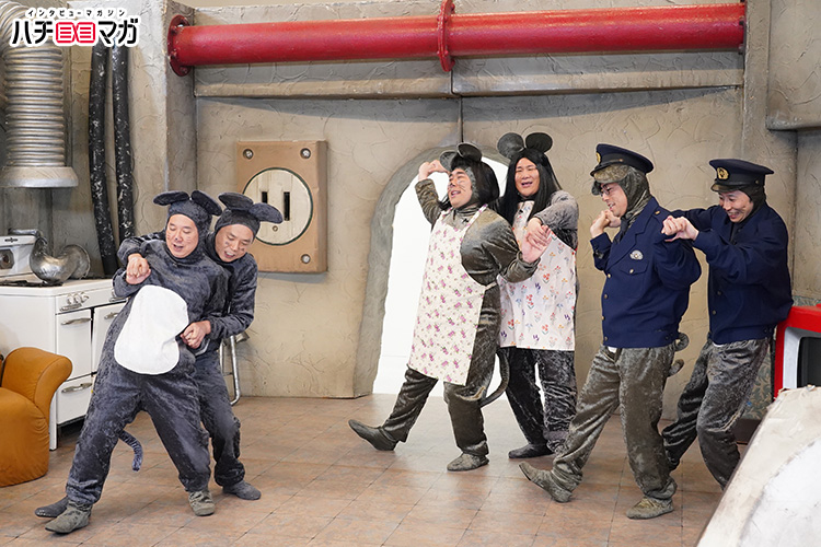 昨年のキングオブコント覇者のビスケットブラザーズが、ねずみの姿になって、爆笑問題扮する爆チュー問題と、大騒ぎの新作コントを繰り広げます。