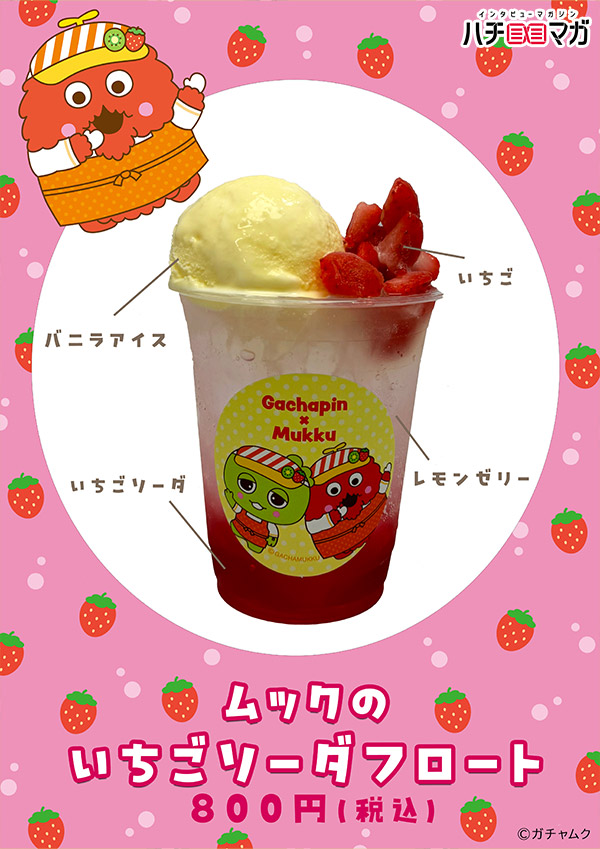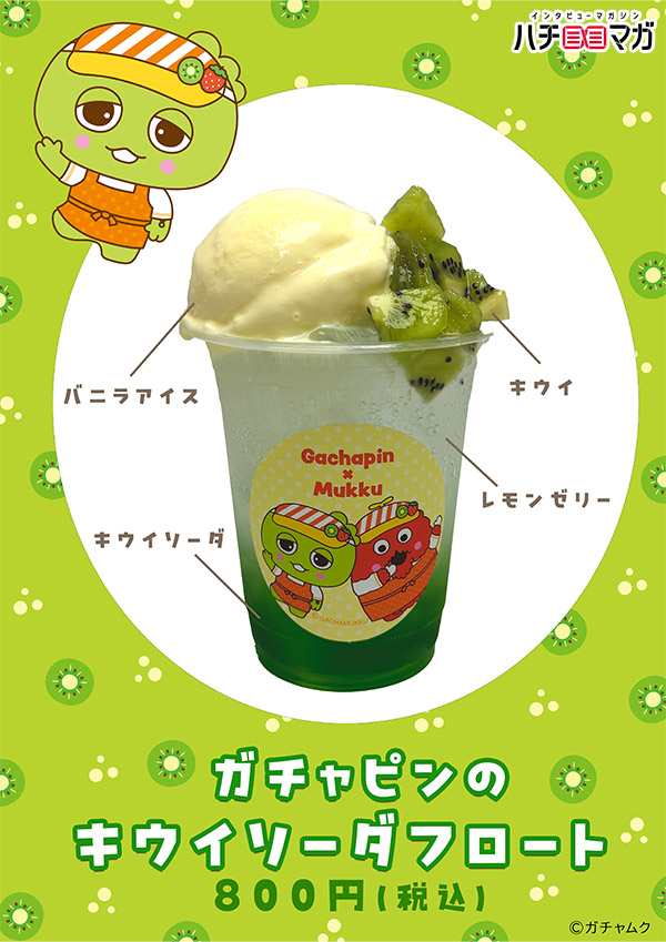 ガチャピンをイメージした「ガチャピンのキウイソーダフロート」、ムックをイメージした「ムックのいちごソーダフロート」はそれぞれアイス・果物・ゼリーが入ったスペシャルなドリンクになっています!