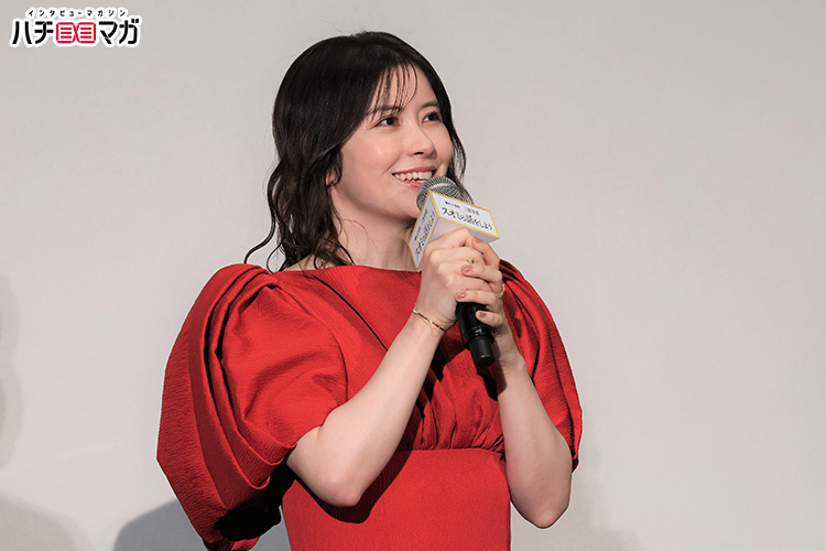 劇中で披露される楽曲が流れるなかステージに姿を見せた長澤さんは、さっそく「去年の今頃撮影していましたが、去年も暑かったなと思い出し、本当にいい時間を過ごしたなと思い出に浸っています」と、撮影を回想しコメント。また、上映後の舞台挨拶ということで「皆さまのもとに届いてホッとしているところです」と続け、笑顔を見せます。そして、西島さんは「幸せになる映画なので、たくさんの方に見ていただきたい」、松坂さんは「まだご覧になっていない方にスオミの話をしていただいて、たくさんの方に見ていただきたいと思っています」、瀬戸さんは「この映画を見ることで、皆さんのストレスみたいなものが少なくなればいいなと思っています」と、それぞれアピールしました。