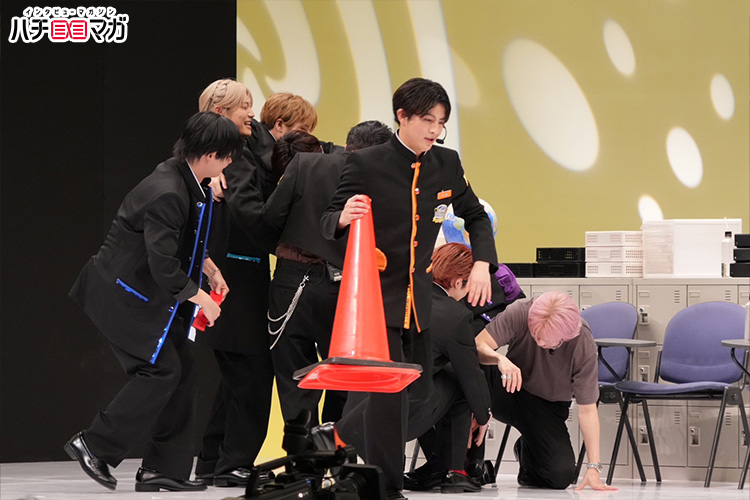 最後は、「クイズ二人三脚」。カイさん&ユーキさん、リョウガさん&ハルさん、タカシさん&アロハさん、マサヒロさん&タクヤさん、シューヤさん&団長安田さんという組み分けで二人三脚をして、クイズで争います。…が、テンションが上がったメンバーたちは、折り返し地点でメンバー全員がぶつかったフリをしながらわちゃわちゃする“バラエティ”を展開。時間を気にする団長安田さん以外が遊び始めてしまい、収拾がつかなくなってしまう一幕も。最後まで楽しみ尽くすメンバーに、観客からも自然と笑顔がこぼれる公開収録となりました。