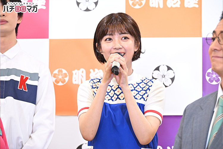 松﨑さんは「ここにいることも嬉しいですし、毎朝、起きて、ごはんを食べて、稽古場に向かうことが幸せ」と紹介。