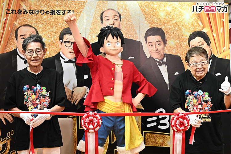 噂の(?)ルフィが、2人のテープカットを見守るために登場すると、「え、来てくれたの?」「びっくりしたなぁ」と驚きつつうれしそうな表情を見せる2人。そんな2人の後ろに立ち、元気よくポージングをするルフィに、加藤さんは思わず「動きがキビキビしてるねぇ」とぼそり。そして、3人で“カトちゃんぺ”をして記念撮影。さらに、テープカットを終えると、ルフィとハイタッチをしてお別れしました。