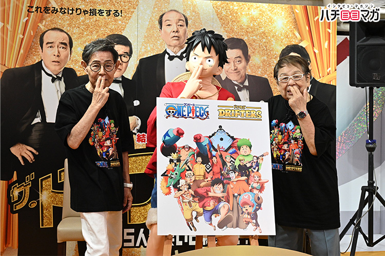 黒いTシャツ姿というラフなスタイルでオープニングイベントに登場した加藤さんと高木さん。まずは、司会を務める西山喜久恵フジテレビアナウンサーから、8月に広島、10月に高崎で本展が開催されることが発表されました。さらに、4月に発表済みの、『ワンピース』とのコラボグッズが、今回の新宿会場で販売されることも発表に。この日、加藤さんと高木さんが着用していたTシャツは、このコラボグッズだったのです。ドリフターズの5人がイラストとなって『ワンピース』のキャラクターたちと共演。さらに、ルフィが“アイーン”をするなど、ファンには熱いコラボイラストとなっています。加藤さんは、Tシャツをじっくりと見つつ「ルフィは世界で一番有名な人でしょ?」と言い、続けて「一番お金稼いでるからね。俺たちよりも稼いでるんだから」と付け加えて会場の笑いを誘いました。