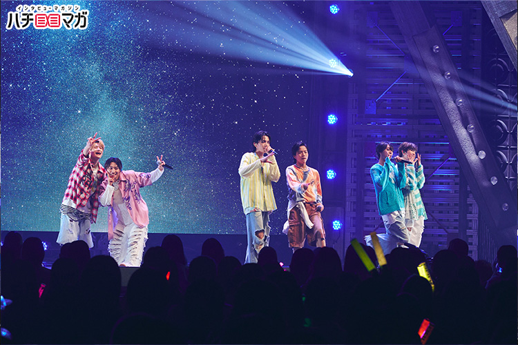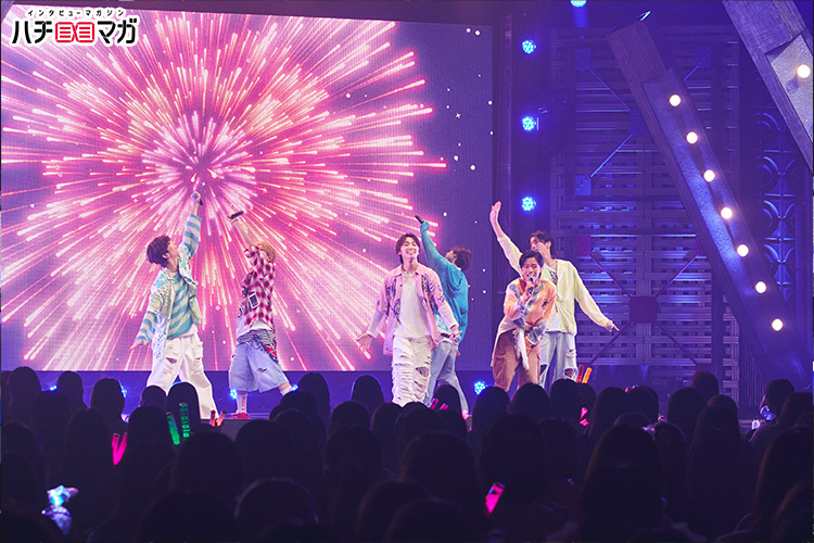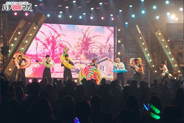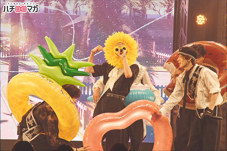 『Hands Up』は太田駿静さんのソロパートからスタート。『Diary』ではメンバーが浮き輪、栗田航兵さんが顔のまわりにヒマワリを装着し、“夏モード”たっぷりのステージを展開。このパートには西島さんも立ち上がって参加し、ひと時のサマーフェスをメンバーと一緒に楽しみます。