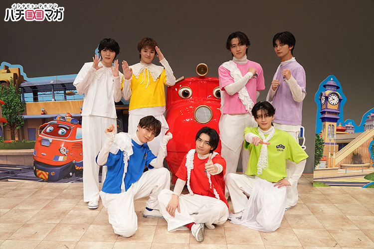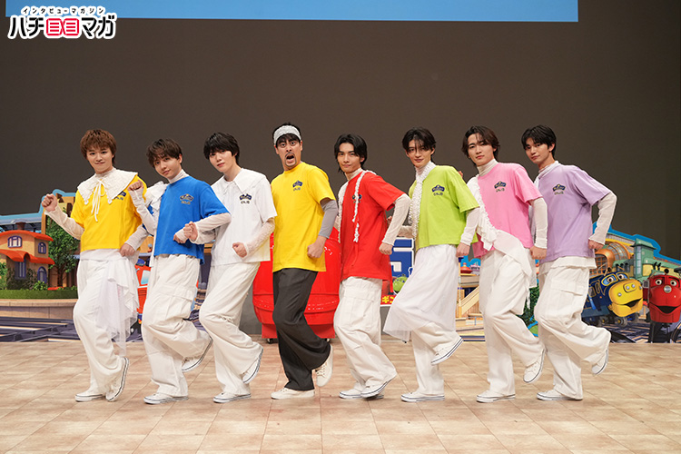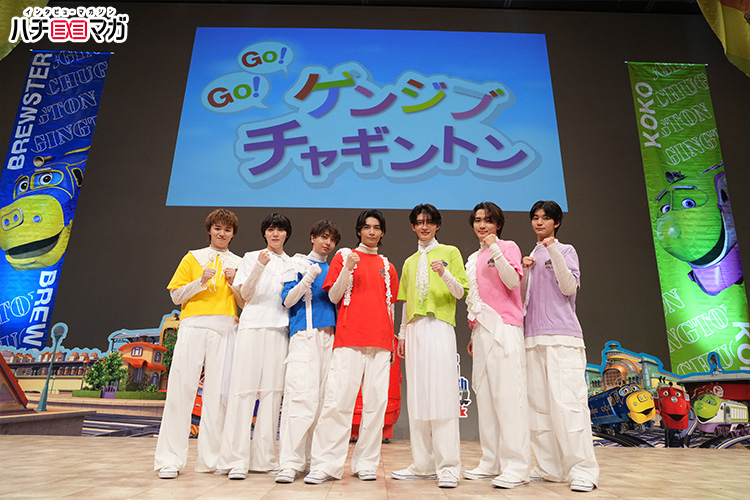 『チャギントン』の世界観が作られたステージに、まずはチャギントンナビゲーターを務める梶谷直史フジテレビアナウンサーが前説として登場。「レッツライド!」のかけ声(コールアンドレスポンス?)や、ゲンジブが歌うコラボソング『カラフるワンダフル』の振り付けをレクチャーして、会場を温めます。そして、ウィルソン(CV:小林由美子)の呼び込みで、いよいよゲンジブがステージに!それぞれ武藤潤さんはウィルソン、杢代和人さんはココ、長野凌大さんはブルースター、大倉空人さんはアクションチャガー、小泉光咲さんはエメリー、桜木雅哉さんはジャックマン、吉澤要人さんはスピーディーの決めセリフとともに自己紹介をすると、会場のボルテージは一気に上昇。メンバーは「僕たちでも笑ってくれるかな?」と客席に問いかけ、観客が「イエーイ!」と大きな声で返して大盛り上がり。