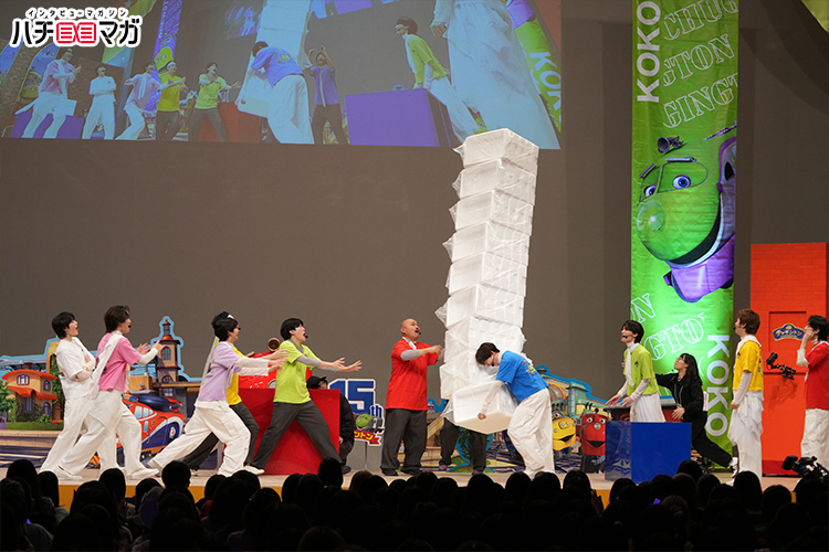 続いて、高速で走るココが荷台に乗せているものを当てる「高速見切れ発車チャギントン」と題した対決。ゲンシダがお題を選んでココの荷台に載せ、ゲンジブが7人で一つ回答を出します。1問目のお題が出された瞬間、ココの高速っぷりに観客からも「えー!?」と驚きの声が。そんななか、早い段階から「たぶん家にある」と自信満々の杢代さんが正解し、メンバーも「すごい!」と称賛。杢代さんは2問目もヒントを出される前から、予想として正解を出しており、動体視力の高さを発揮していました。3問目は難題で、「おもちゃ」というヒントから「チャギントン15周年アンバサダー」らしい回答をするゲンジブ。小泉光咲さんが「アンバサダー感あったね(笑)」と言い、全問正解とはならなかったものの、しっかりと“アンバサダー”を魅せるメンバーでした。